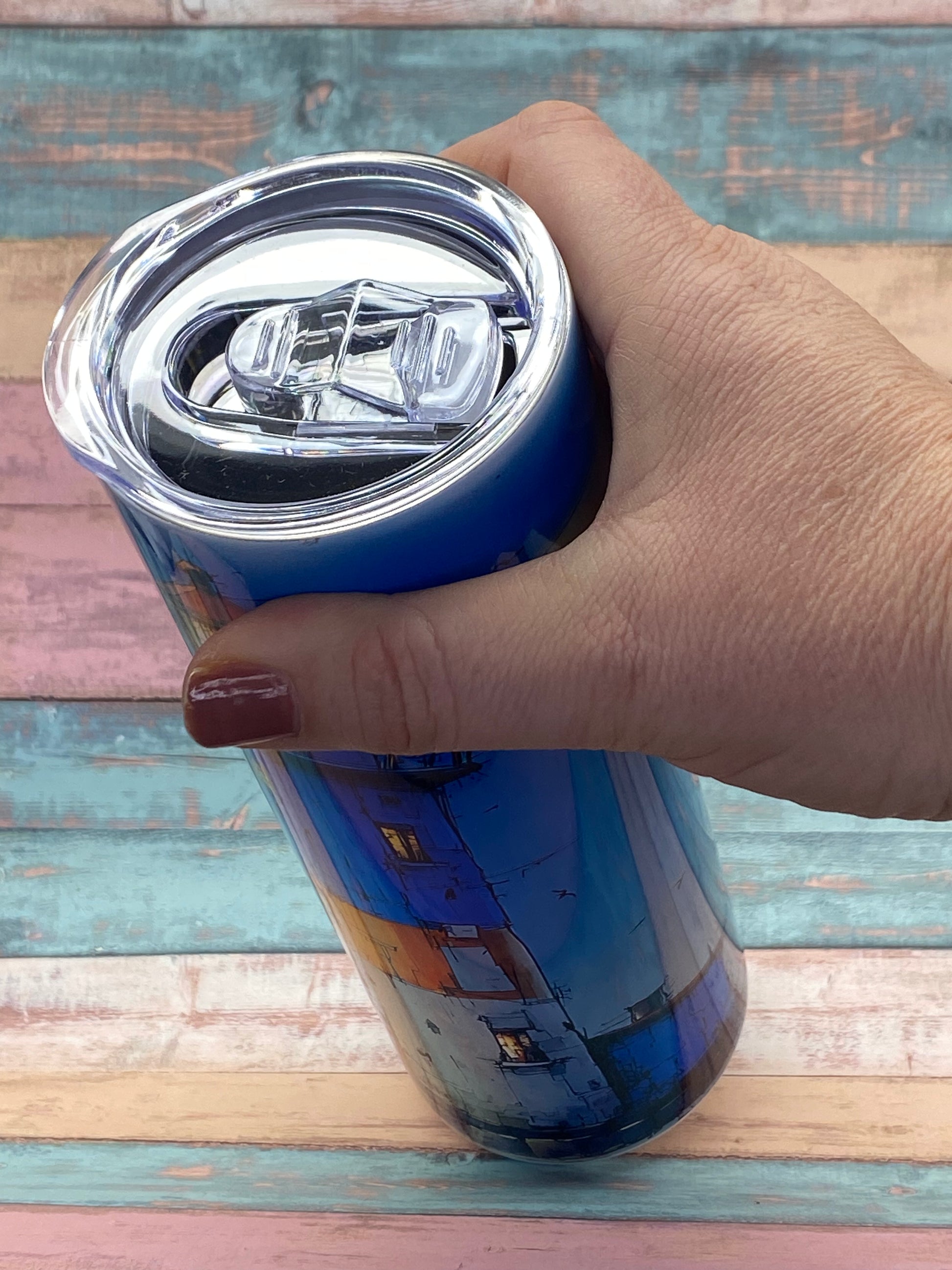 Dieser hochwertige Edelstahl-Tumbler mit Leuchtturm-Motiv vereint maritime Tiefe mit künstlerischem Charme. Der leuchtende Turm vor tiefblauem Himmel steht für Hoffnung, Heimkehr und Fernweh – ein echter Blickfang für alle, die das Meer lieben.