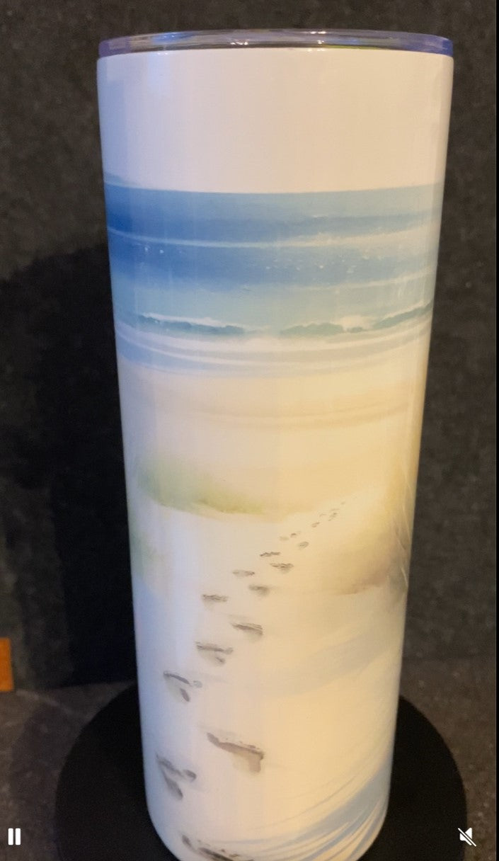 Der wunderschöne Thermobecher „Spuren im Sand“ fängt das Gefühl eines Spaziergangs am Strand ein. Sanfte Sandfarben, zarte Fußspuren und die weite Sicht aufs Meer – ein Motiv, das Ruhe und Fernweh zugleich weckt.