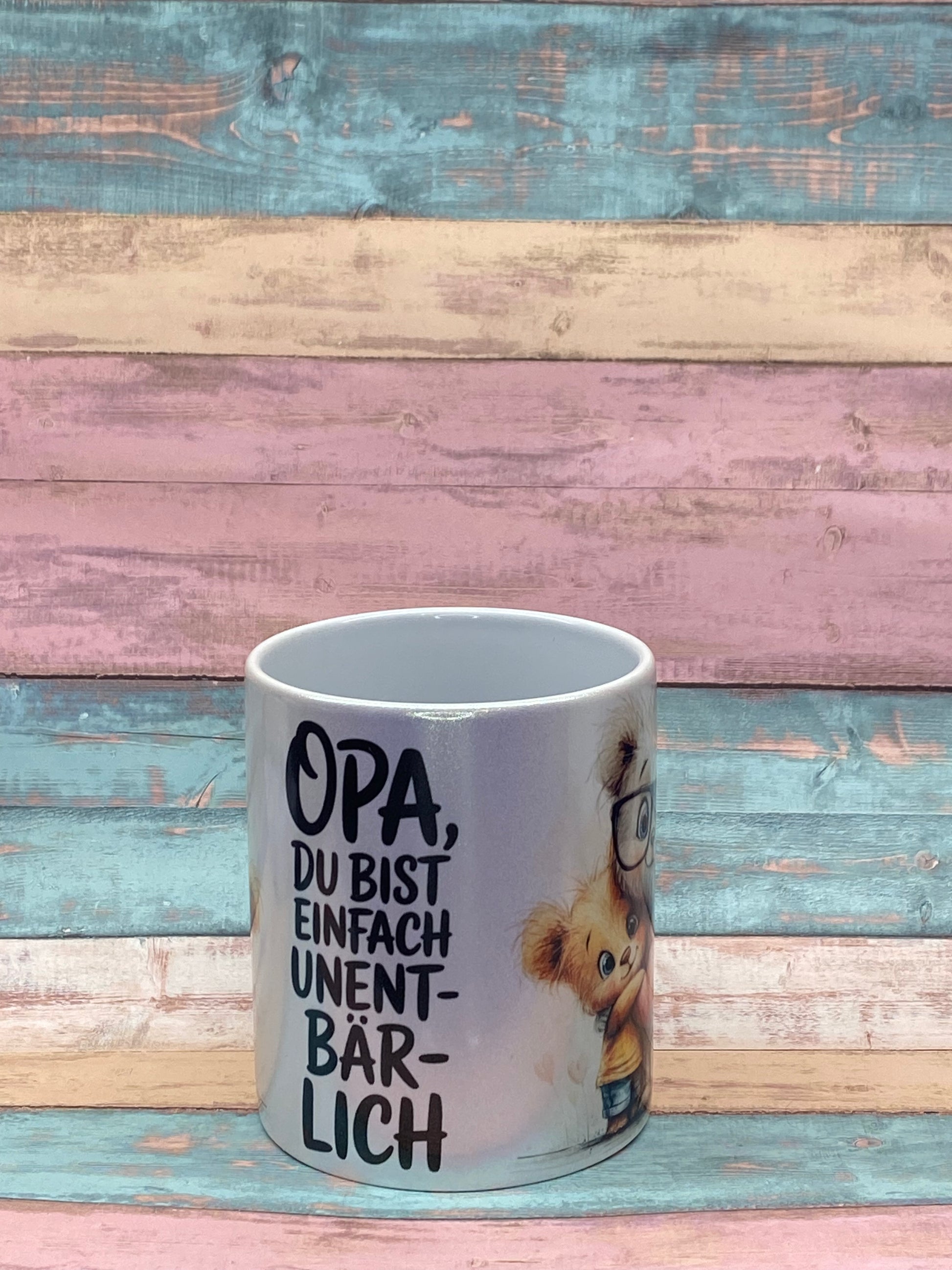 Diese liebevoll gestaltete Keramiktasse ist eine herzliche Botschaft an jeden Opa. Der Spruch „Opa, du bist einfach unent-bär-lich“ wird ergänzt durch eine niedliche Illustration eines Bärenopas mit Brille und seinem Enkel, die sich innig umarmen. Kleine Herzdetails unterstreichen die Wärme und Verbundenheit dieses Motivs.